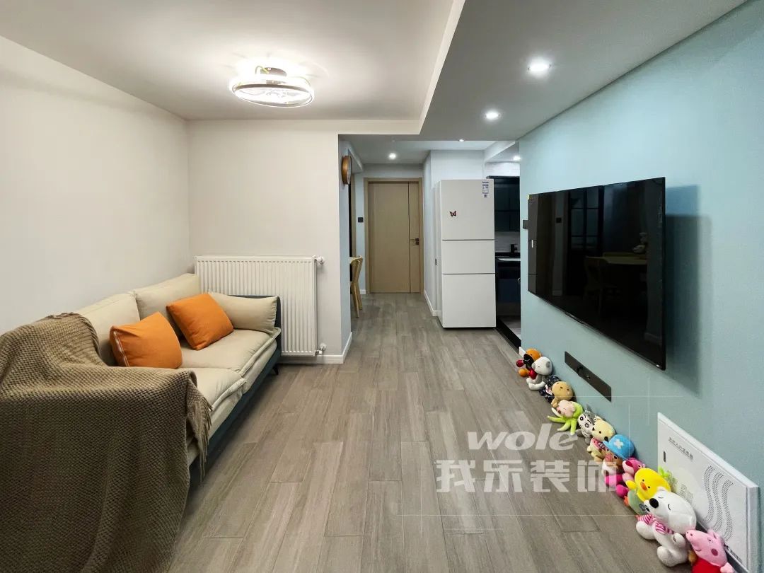 客廳沒有過多的裝飾,因?yàn)榧依锶藛T多、面積小,所以裝修越簡單越顯大,開門就是玄關(guān)柜,淺灰加上深灰色系,簡約又高級,電視背景墻整面涂上藍(lán)色乳膠漆,更是把客廳顏值抬到了一個(gè)高峰。